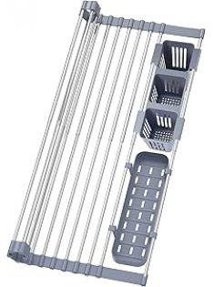 Expandable Roll Up Dish Drying Rack Up to 22.8''with 2 Storage Baskets,Over The Sink Kitchen Rolling up Dish Drainer, Foldable,Rollable for Cups,Fruits,Forks