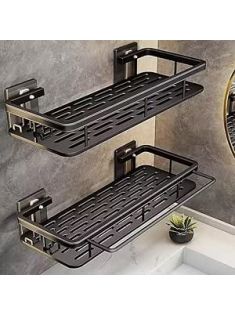 EVALAND Aluminum Shower Caddy, Adhesive Shower Shelves, 2-Pack With Hooks and Rod for Towels, No Drill Wall Mount Rustproof Premium Organizer for Bathroom, Kitchen, Black