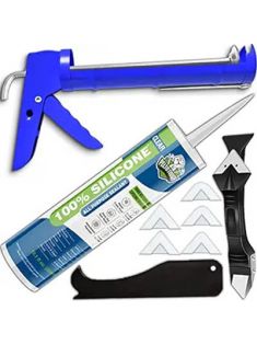 Clear Silicone Sealant + Caulk Gun + Caulking Tool Kit - All-Purpose 100% Silicone Caulk (10 oz Tube), with Dripless Gun, 3-in-1 Scraper/Smoothing Tool, Caulk Removal Tool.