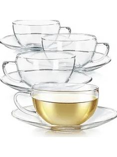 Teabloom Kyoto Teacup and Saucer Set 4-Pack – Medium Size – 8 OZ/ 240 ML Capacity – Premium Borosilicate Glass – Heat Resistant, Microwave Safe