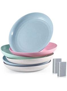Wheat Straw Plates 10 Inch (6 Pack), Microwave Safe Plate - Unbreakable Deep Dinner Plates and Dishwasher Safe Plastic Plates Reusable for Kids Toddlers Adults, with 2 Sponges