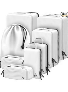 Well Traveled 8-Piece Deluxe Compression Packing Cubes for Travel - Maximize Space in Luggage with HybridMax Double Capacity Design, Luxury Suitcase Organizer Bags, Large, Small, & Medium Set, White