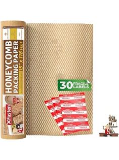 XFasten Brown Honeycomb Packing Paper for Moving 15-Inch x 118-Feet Bubble Honeycomb Wrap, Honeycomb Wrapping Paper for Packing Cushion with 30 Fragile Stickers Packaging Material
