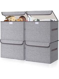 Large 22 Quart Linen Fabric Foldable Storage Bin Cube Organizer Basket with Flip-Top Lid & Handles, Clothes Blanket Box for Home, Office, Closet, Gray, 4 Pack 14.6 x 9.5 x 9.5”