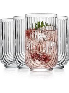 Glaver's Vintage Glassware Art Deco Glasse Ribbed Drinking Glasses U-Shape Arch Design Colored Cocktail Kitchen Tumblers Everyday Dinner Decorative Party (Clear S/4 17oz)