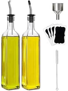 Olive Oil Dispenser Bottle, 2 Pcs Glass Olive Oil Dispenser and Vinegar Dispenser Set with 2 Stainless Steel Pourers, 4 Labels,1 Brush and 1 Funnel Oil Bottles for Kitchen (500ml)