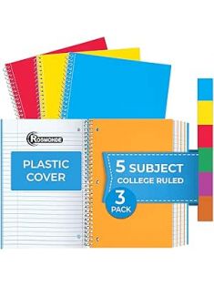 5 Subject Spiral Notebook, 3 Pack, College Ruled, Water Resistant Cover, Thick 300 Pages/Book (150 Sheets), 8 x 10-1/2, 3 Hole, Colored Dividers, Assorted Colors, Bulk School & Office