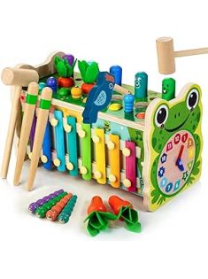 6-IN-1 Wooden Montessori Toys for 1 Year Old, Whack-A-Mole Game | Play the Xylophone | Frog Clock | Carrot Harvest Game | Spinning Gear, Toddler Toys Aged 1-4, Baby Toy Gift for Early Learning