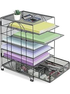 6-Tier Paper Organizer for Desk, Letter Tray with Drawer, Metal Mesh Desk File Letter Sorter Organizer with Sliding Tray for Office Supplies, Black