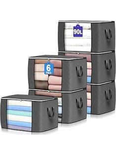90 L Large Storage Bags, 6 Pack Clothes Storage Bins Foldable Closet Organizers Storage Containers with Reinforced Handle for Clothing, Blanket, Comforters, Bed Sheets, Pillows and Toys (Gray)