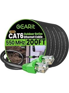 GearIT RJ45 Cat-6 Ethernet Patch Cable, 10Gpbs Transfer Speed, Gold-Plated Connectors, Copper Clad, Outdoor, UV Resistant, Direct Burial, Waterproof, Durable, 200 Foot (60.9 Meters), Black