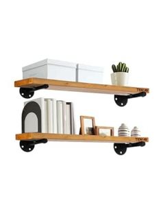 Industrial Pipe Wood Wall Shelf - 24" Real Wooden Shelving w/ Special Walnut Color - Modern Interior Decor Floating Shelves w/ Iron Pipe Brackets - Rustic Farmhouse Style Bookshelf by TEN49 - Set of 2