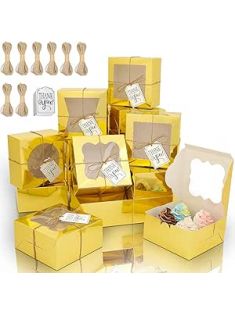 KPOSIYA 65PCS Bakery Boxes with Window 6x6x3 Inches 5 Style Cookie Boxes Small Pastry Boxes for Candy, Dessert, Pastry, Donuts, Birthday Party, Wedding(Gold)
