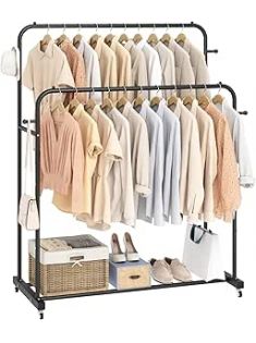 Laiensia Double Rods Garment Rack with Wheels, Clothing Rack for Hanging Clothes,4 Hooks, Multi-functional Bedroom Clothes Rack, Black