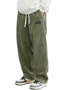 Mens Corduroy Casual Pants Fashion Loose Fit Wide Leg Pants Straight Sweatpants Elastic Waist Drawstring