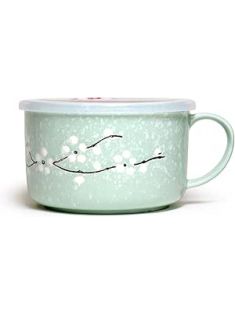 Microwavable Ceramic Noodle Bowl with Handle and Seal Fine Porcelain Sakura Snow Flake Floral Design (OliveGreen)