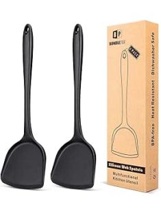Pack of 2 Silicone Wok Spatula, Non-Stick, Heat Resistant, Easy to Clean and Dishwasher Safe, Seamless Kitchen Utensil for Cooking, Baking, Stir-Fry (Black)