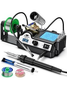 Preciva 927II Digital Soldering Station Kit, 60W High Power with 5 Extra Iron Tips, 2 Helping Hands, Lead-Free Solder, Solder Sucker, Tip Storage Slots, Tip Cleaner, °C/°F Conversion, Auto Sleep