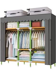 Portable Closet 65 Inches Potable Wardrobe Clothes Closet, Colored Rods and Grey Cover Storage Organizer, Quick and Easy to Assemble, Extra Sturdy, Strong and Durable