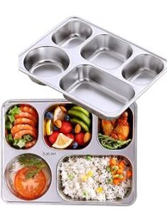 Set of 2 Stainless Steel Rectangular Divided Plates Tray 5 Sections Dinner Plates for Adults - Unbreakable Metal Plate for Campers, and Portion Control Reusable Plate