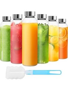 Set of 6 Clear Glass Water Bottles with Lid 18oz for Juicing Reusable Bottle Glass Cup with Stainless Steel for Juicing, Refrigerator 100% Leak Proof Drinking Jar, BPA Free