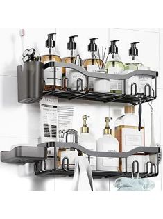 Shower Caddy Adhesive Shower Organizer Bathroom Shower Shelves, Shelf for Inside Shower Storage with Soap Dish&16 Hooks, Rustproof Stainless Steel No Drilling Rack Home Decor 2 Pack Black