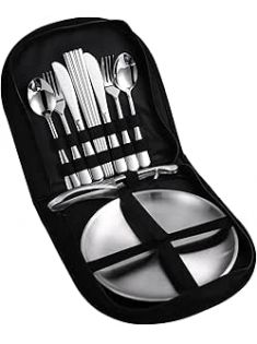 Stainless Steel Outdoor Camping Mess Kits - Includes Forks, Spoons, Knives, Chopsticks, Food Clip, Plates - Portable Cutlery Bag