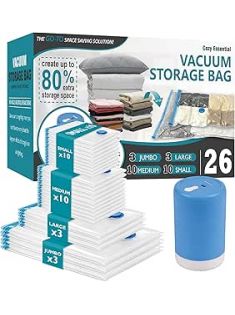 Vacuum Storage Bags with Electric Pump, 26 Pack (3 Jumbo/3 Large/10 Medium/10 Small) Vacuum Seal Space Saver Bags for Clothing, Pillows, Blanket, Bedding, Comforters