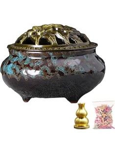 Ceramic Incense Burner with Lid, Bowl Burner, Cone Incense Burner, Ceramic Censer Suitable for Incense/Cone/Coil/Sticks, There are 30 Incense Cones+ Metal Incense Holder+Fireproof Cotton Inside.