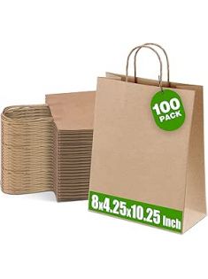 Ginkgo 100 Pcs Paper Gift Bags with Handles, Medium Size Brown Paper Bags 8x4.25x10.25 Inch, Kraft Bag for Party, Favor, Goodie, Grocery and Shopping