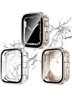 2 Pack 2 in 1 Waterproof Case for Apple Watch Series 8 7 45mm, Straight Edge PC Front & Back Bumper with Tempered Glass Screen Protector 360 Protective Cover for iWatch (45mm, Starlight/Clear)