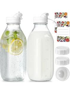 2 Pack Glass Milk Bottle with 2 Dispenser Caps, 100% Airtight Heavy Duty Screw Lid. 32 Oz Reusable Glass Water Jug with 3 Lids! Breast Milk Pitcher, Buttermilk, Nut, Juice, Syrup, Coffee Creamer