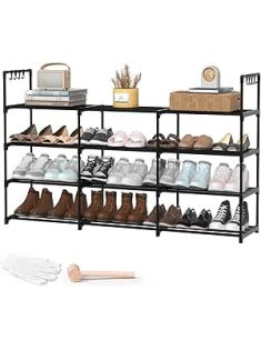 3-Row 4-Tier Shoe Rack, Black Metal Stackable Shoe Shelf with Multifunctional Hooks, Hold 24-30 Pairs, Space Saving Shoes Organizer for Closet,Show Rack