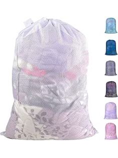 Polecasa Extra Heavy Duty Large Diamond Mesh Laundry Bags with Drawstring Closure & ID Tag, 24 x 36 inches Washable Storage Bag for College, Travel, Sports, Dorms, White