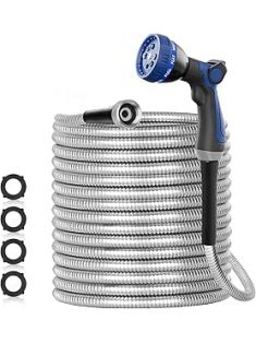 SPECILITE 50ft 304 Stainless Steel Garden Hose Metal, Heavy Duty Water Pipe with Nozzles for Yard, Outdoor - Flexible, Never Kink & Tangle, Puncture Resistant (Sliver)