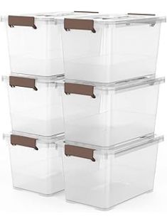 WYT 6-Pack Clear 7 Quart Storage Latch Box/Bins, Plastic Stackable Latching Box with Brown Handle and Lid, Multi-Purpose, 7 Litre