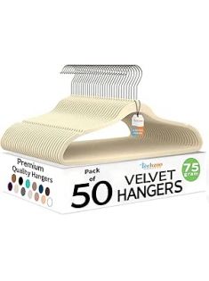 50 Pack New Premium Quality Velvet Hangers Ultra Thin Non Slip Adult Felt Space Saving Hangers for Closet Heavy Duty Coat Pants Jackets Dress Hangers 360° Swivel Hook Hold Upto 10 lbs Ivory