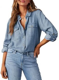 Astylish Women Button Down Denim Shirts Casual Long Sleeve V Neck Chambray Blouse Top