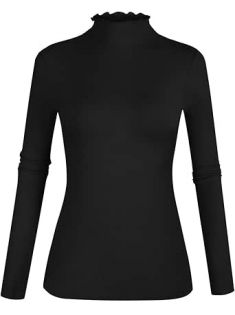 POPZONE Women's Lettuce Trim Mock Neck Long Sleeve Slim Fit Ribbed Knit Tee Shirt Tops