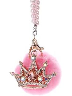 Car Mirror Hanging Accessories, Mini-Factory Rearview Mirror Hanging Bling Decoration Fluffy Luxury Diamond Crown with Pearl Chain - Pink