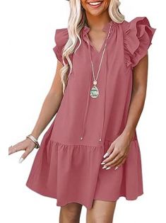 Dokotoo Womens 2024 Summer V-Neck Drawstring Ruffle Cap Short Sleeve Side Pockets Mini Dress Sundress