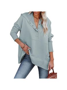 Women Casual Button V Neck Hoodies Oversized Pullover Sweatshirt Hooded Tops with Pockets